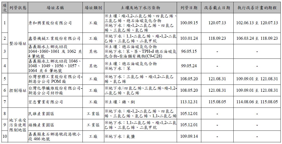 嘉義縣環保局轄區內,依據土污法所公告列管之場址數量截至114年12月31日共有10處,分別為4處整治場址、3處控制場址及3處地下水受污染限制使用地區,各列管場址現況說明如下圖表所示。