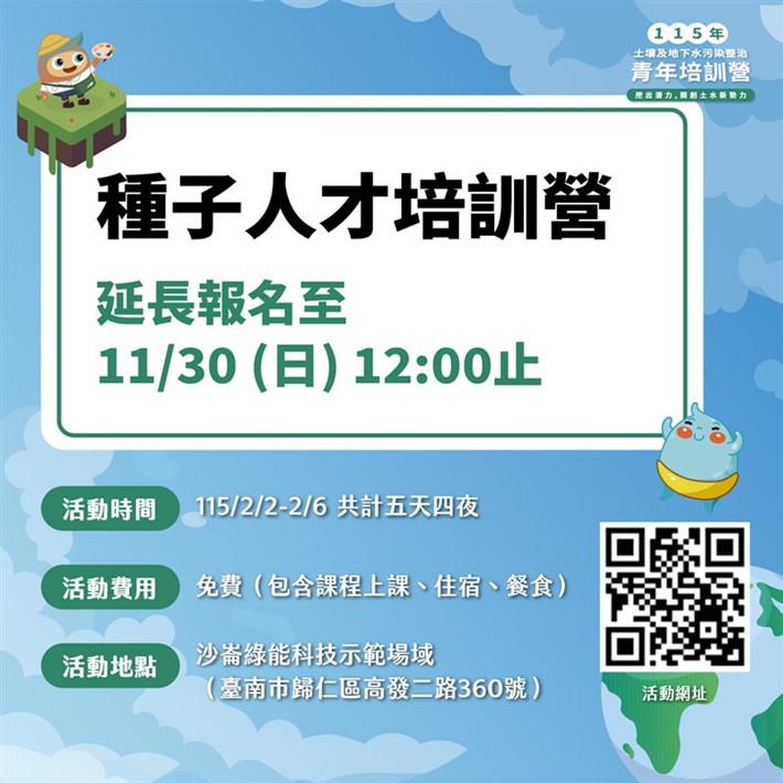 想提前認識土水產業,體驗課本以外的真實現場嗎?土壤及地下水污染整治基金管理會將於115年2月2日至2月6日舉辦「115年土壤及地下水污染整治青年培訓營」,五天四夜課程結合專業課程、講座、業界參訪與現地實作,帶你深入了解土壤及地下水領域的工作樣貌。